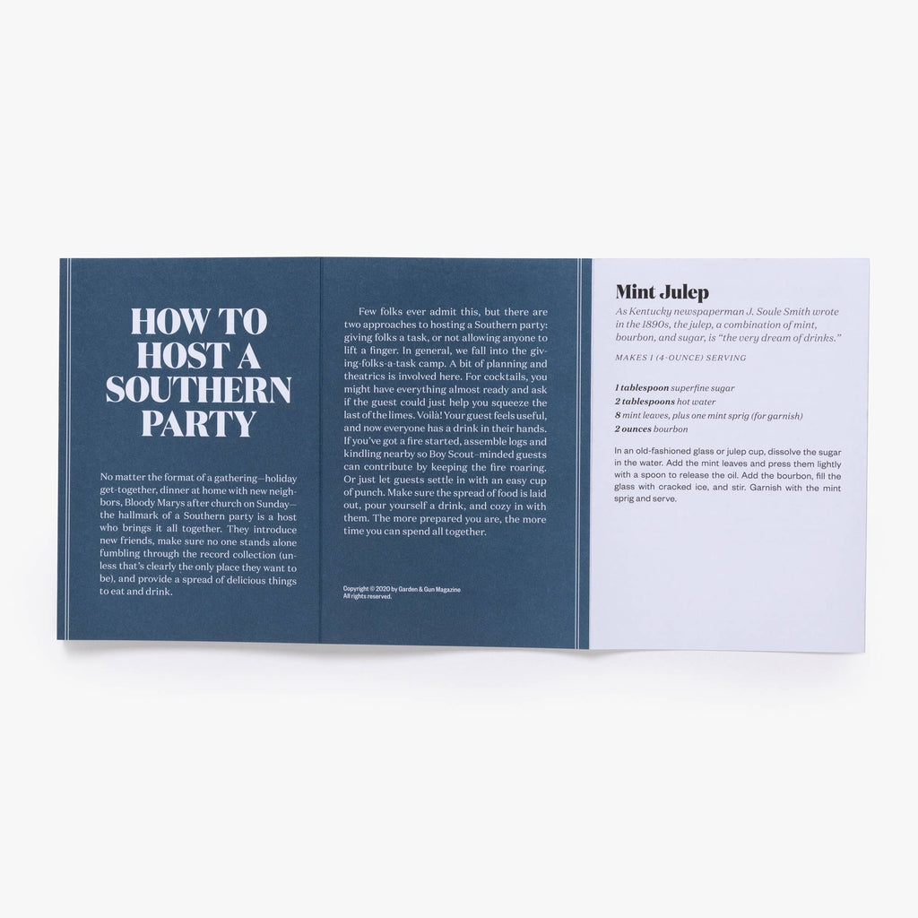 An enclosed booklet offers instructions for those who want to set up a proper trivia night for two or more competitors and play in rounds for points. However, the cards work just as well as conversation starters displayed during cocktail hour. Next time you throw a party, pour out some bourbon or sweet tea, and pull out this game to test the knowledge of the Southerners (and those who are just curious about the South) among you. For folks who don't do so well--bless their hearts.