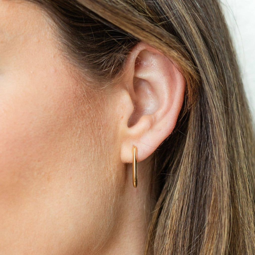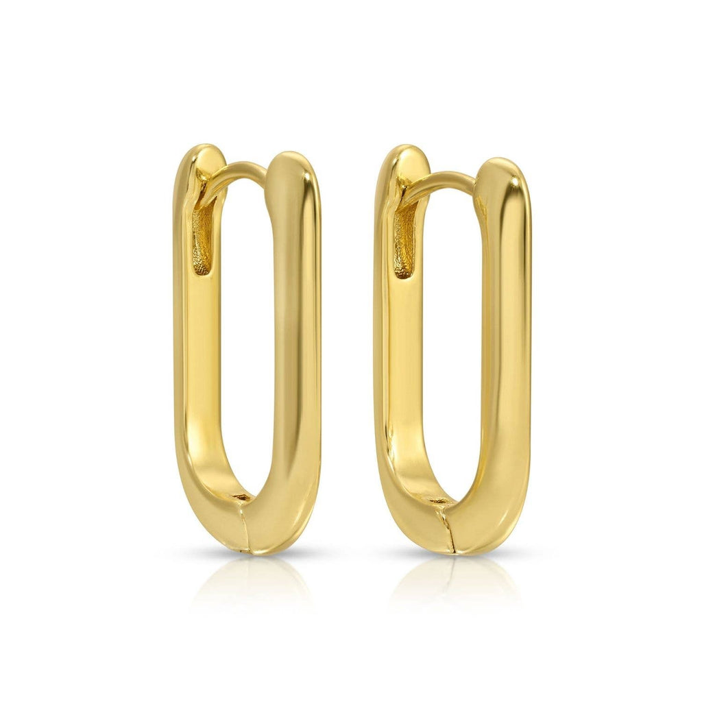 Elevate your earring game with a fresh, modern twist! Our Oblong Huggies offer a sophisticated take on the classic hoop, designed to add unique style and comfortable wear to your everyday look. Meticulously crafted with a brass base, these distinctive huggies are plated with your choice of radiant 18K gold.