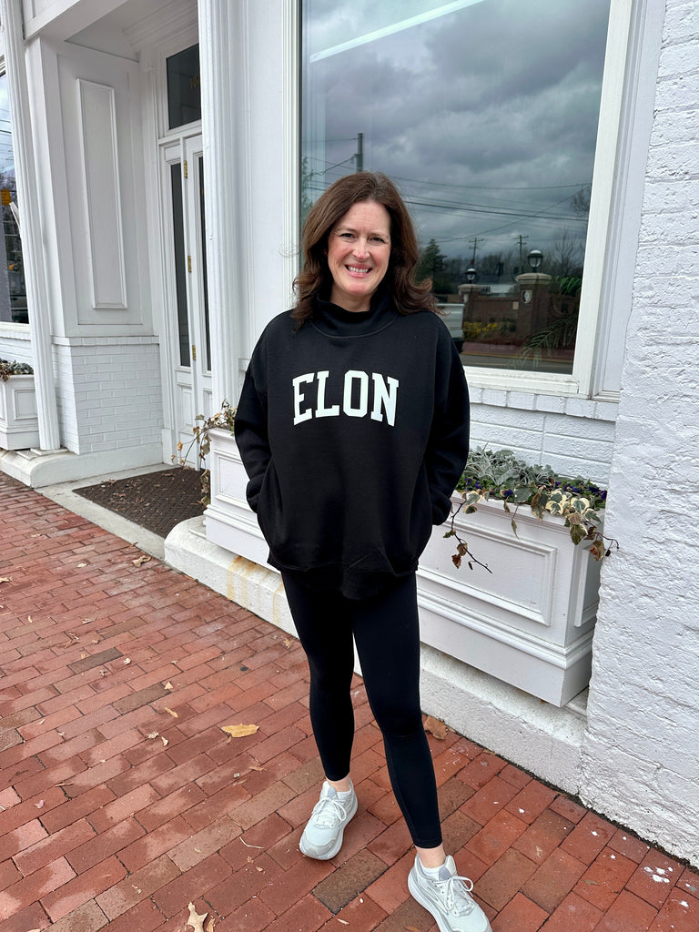 You asked for it and here it is...a black mock neck sweatshirt with an arched Elon in white across the chest. Oversized and it even has pockets. A mockneck with pockets? We call it win/win!